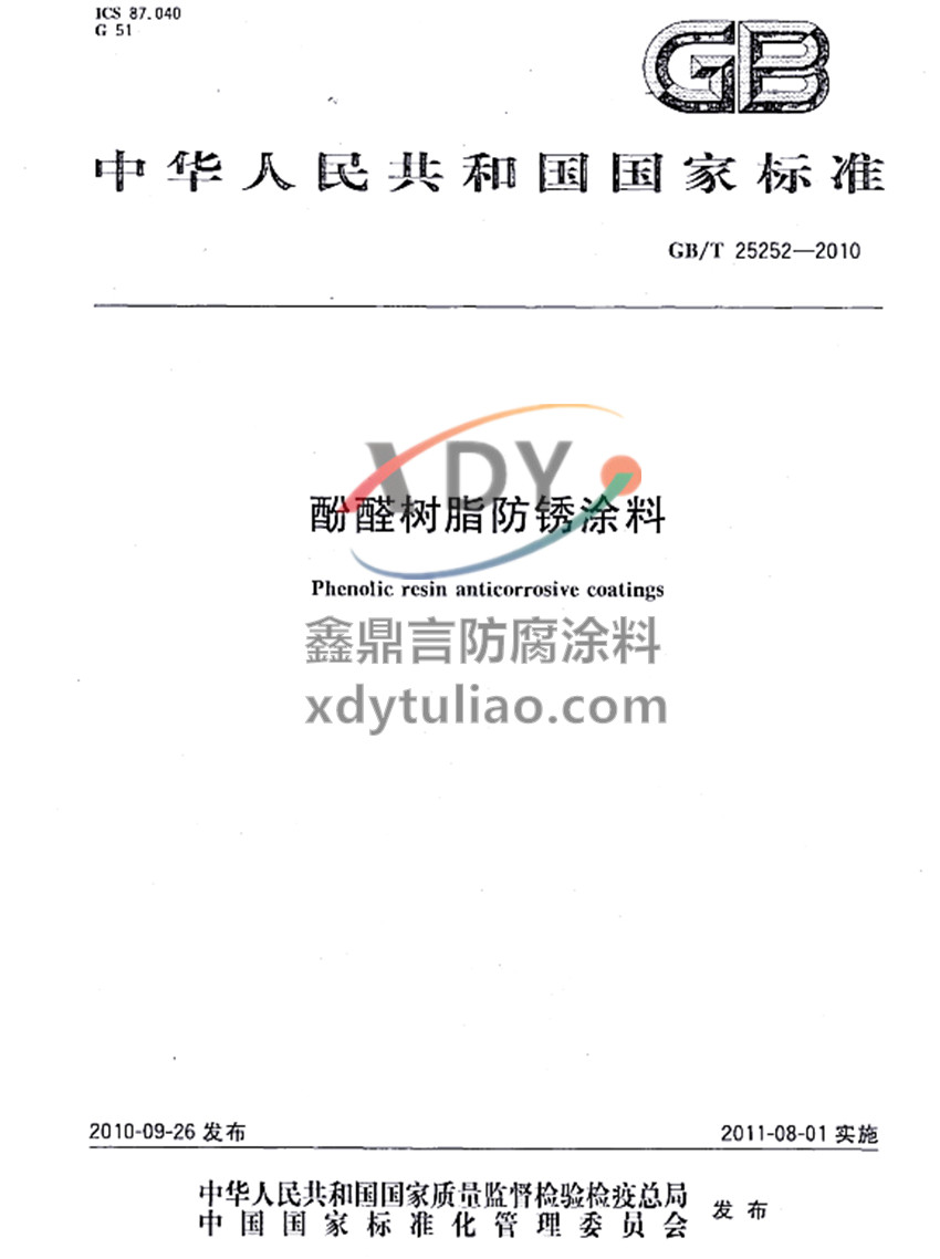 GB/T 25252-2010酚醛樹脂防銹涂料標準 ICS 87.040 G51 GB 中華人民共和國國家標準 GB/T 25252-2010 酚醛樹脂防銹涂料Phenolic resin anticorrosive coatings 2010-09-26發(fā)布 2011-08-01實施 中華人民共和國國家質(zhì)量監(jiān)督檢驗檢疫總局 中國國家標準化管理委員會 發(fā)布 本標準規(guī)定了酚醛樹脂防銹涂料的要求、試驗