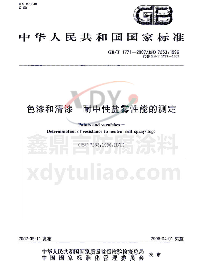 GB/T1771-2007色漆和清漆 耐中性鹽霧性能的測定標準是照搬GB/T1771-2007《色漆和清漆 耐中性鹽霧性能的測定​》紙質(zhì)版內(nèi)容。大家可以放心參考。 ICS 87.040 G50 GB 中華人民共和國國家標準 GB/T1771-2007/ISO 7253:1996代替GB/T1771-1991 色漆和清漆 耐中性鹽霧性能的測定Paints and var