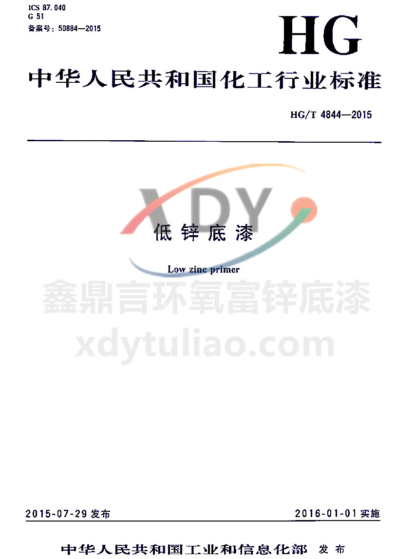 ICS 87.040 G51 備案號(hào):50884-2005 HG 中華人民共和國(guó)化工行業(yè)標(biāo)準(zhǔn) HG/T 4844-2015 低鋅底漆Low zinc primer 2015-07-29發(fā)布 2016-01-01實(shí)施 中華人民共和國(guó)工業(yè)和信息化部 發(fā)布 本標(biāo)準(zhǔn)規(guī)定了低鋅底漆的產(chǎn)品分類、要求、試驗(yàn)方法、檢驗(yàn)規(guī)則、標(biāo)志、包裝和貯存。本標(biāo)準(zhǔn)適用于不揮發(fā)分中金屬鋅含量低于60%但不低于40%的低鋅涂