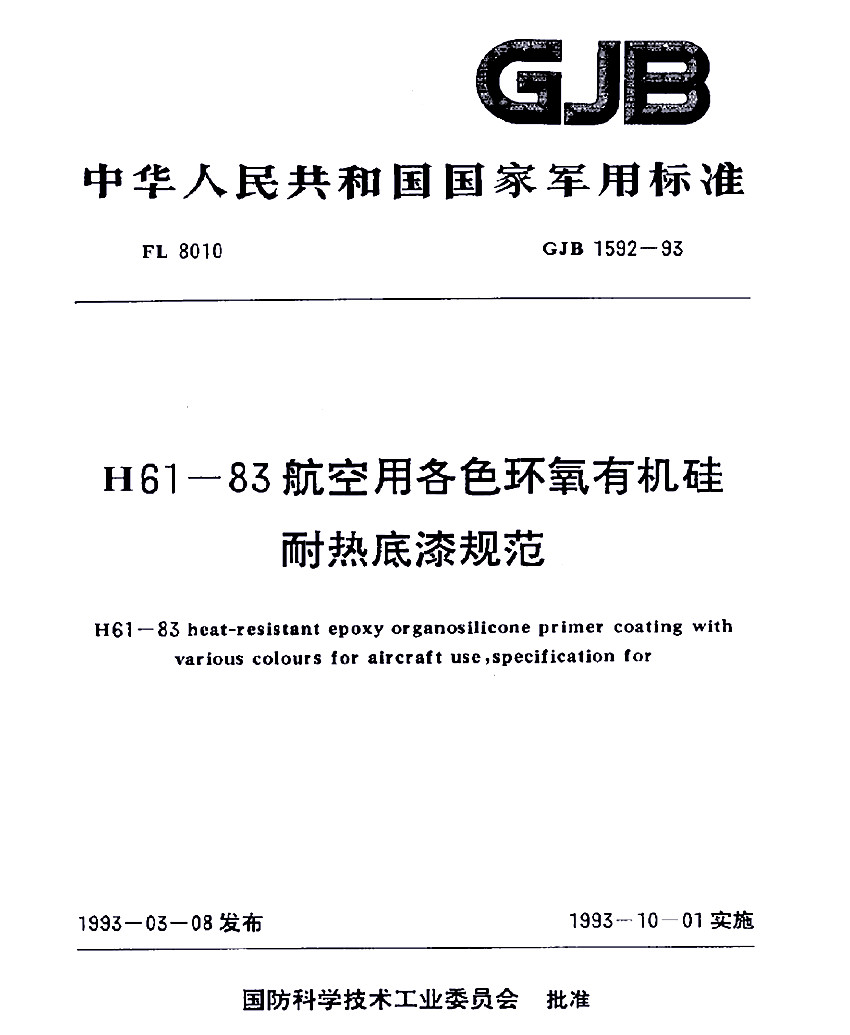 H61-83航空用各色環(huán)氧有機硅耐熱底漆規(guī)范標準GJB 1592-93 GJB 中華人民共和國國家軍用標準 FL8010 GJB 1592-93 H61-83航空用各色環(huán)氧有機硅耐熱底漆規(guī)范 H61-83 Heat-resistant epoxy organosilicnne primer with coating with various colours for aircraft use,sp