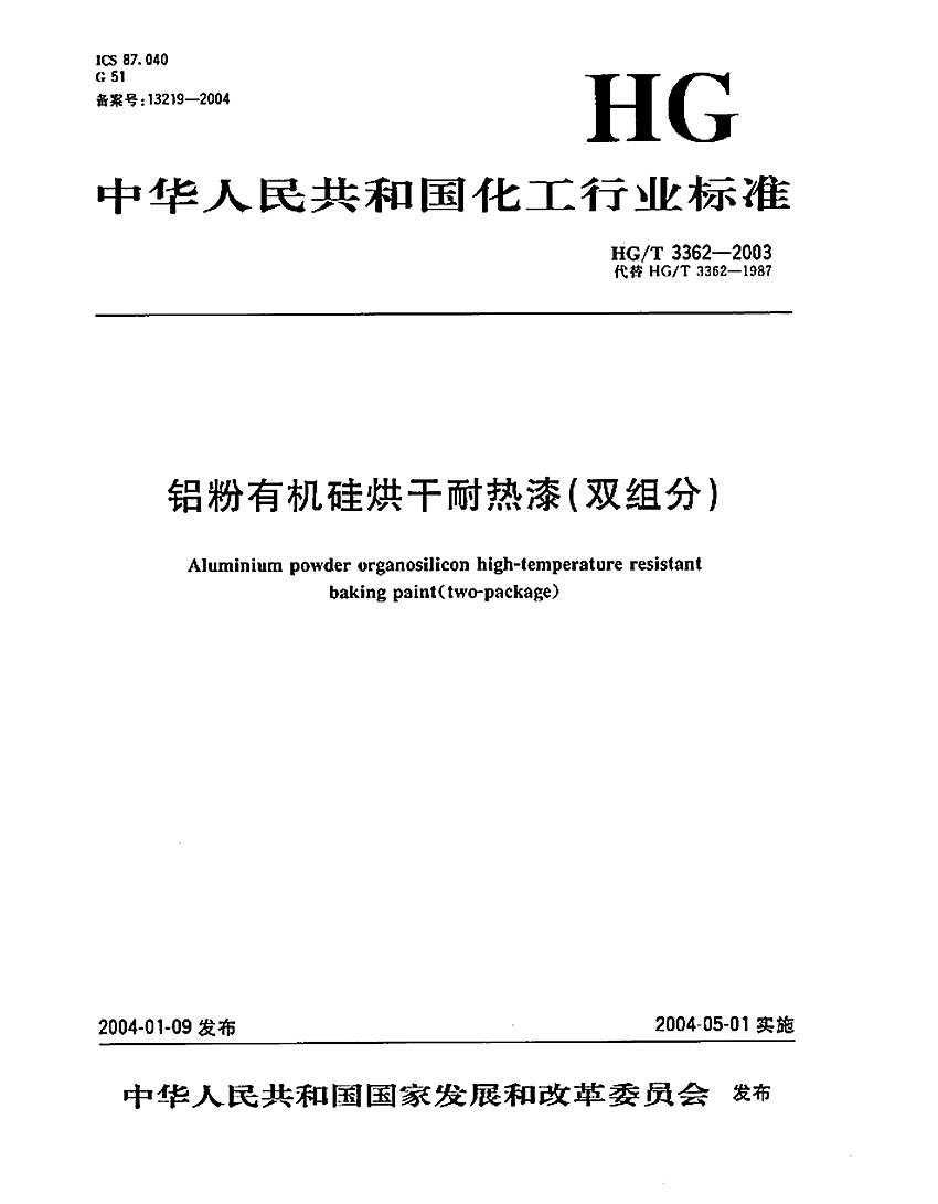 有機硅耐高溫漆標準HG/T3362-2003 ICS 87. 040 G 51 備案號:13219-2004 HG 中華人民共和國化工行業(yè)標準 HG/T 3362-2003代替 HG/T 3362-1987 鋁粉有機硅烘干耐熱漆(雙組分) Aluminium powder organosilicon high-temperature resistant baking paint(two-