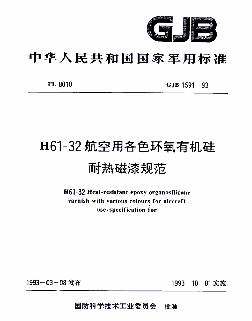 H61-32各色環(huán)氧有機硅耐熱磁漆標準GJB 1531- 93 GJB 中華人民共和國國家軍用標準 FL8010 GJB 1531- 93 H61- 32航空用各色環(huán)氧有機硅耐熱磁漆規(guī)范 H61-32 Heat-resistant epoxy organosilicnne vrnish with various colonrs fnraircrufl use speciflc