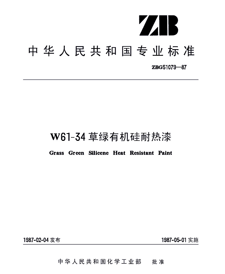 HG/T 3361-1987 W61-34草綠有機硅耐熱漆標準ZBG51079-87(代替HG 2-637-74) ZB 中華人民共和國專業(yè)標準 ZBG51079-87 W61-34草綠有機硅耐熱漆Grass Green Silicene Heat Resistant Paint 1987-02-04發(fā)布,1987-05-01實施 中華人民共和國化學(xué)工業(yè)部 批準 ZBG51079-87代替HG 2